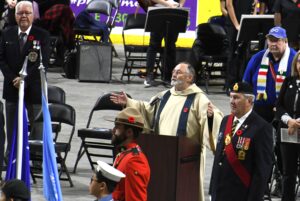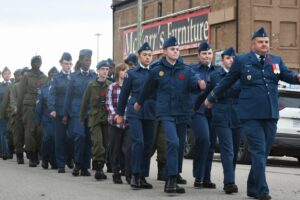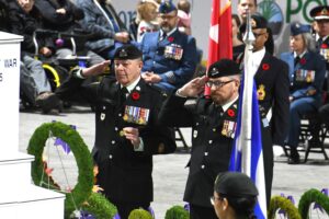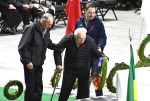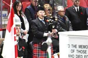The ceremony began with Canada’s national anthem at 10:45 a.m. and the invocation conducted by Rev. Doug Shepherd at 10:47 a.m. Shepherd then read from scripture, shared a message of remembrance, and led prayers to follow. “The Last Post” was performed by Rick Elmer, CD, followed by two minutes of silence.